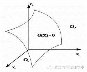 式中 x 随机变量表示影响机械产品功能的各种随机因素,如载荷、材料、尺寸、表面粗糙度、应力集中等。这个函数称为功能失效极限状态函数,简称功能函数或极限状态函数,它表示了产品所处的状态,G(x)大于0,表示产品能完成规定的功能,处于可靠状态;G(x)小于0,表示产品不能完成规定的功能,处于失效状态。从几何上看,G(x)=0,可看作一个曲面,称为极限状态曲面,其将随机变量的空间划分为两个区域,如图所示。通过专业软件分析计算就可以得出针对具体故障模式的可靠性结果,针对可靠寿命计算分析也是一个道理。
