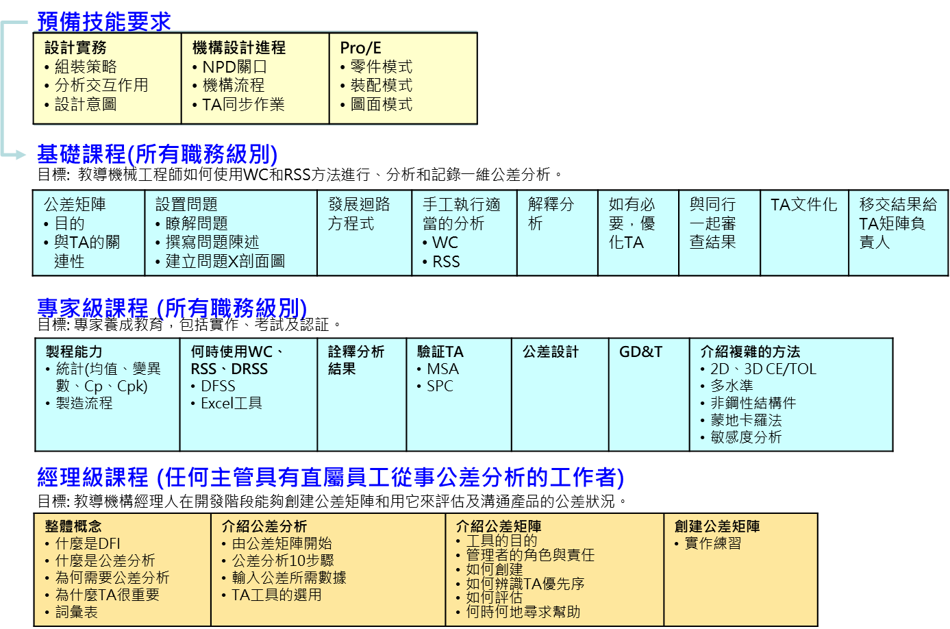 我們根據實務上的需要規劃了公差分析與設計的系列課程, 包括【預備技能】、 【基礎課程】、【專家級課程】 、【經理級課程】四門課,適用於初級工程師、資深工程師到管理階層,涵蓋所有研發團隊。