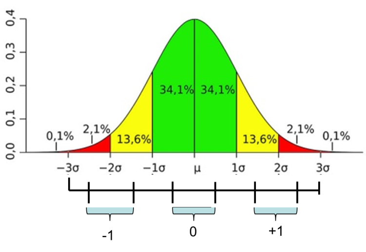 median, mode)為“0”, 左邊為 –1, 右邊為 +1 .