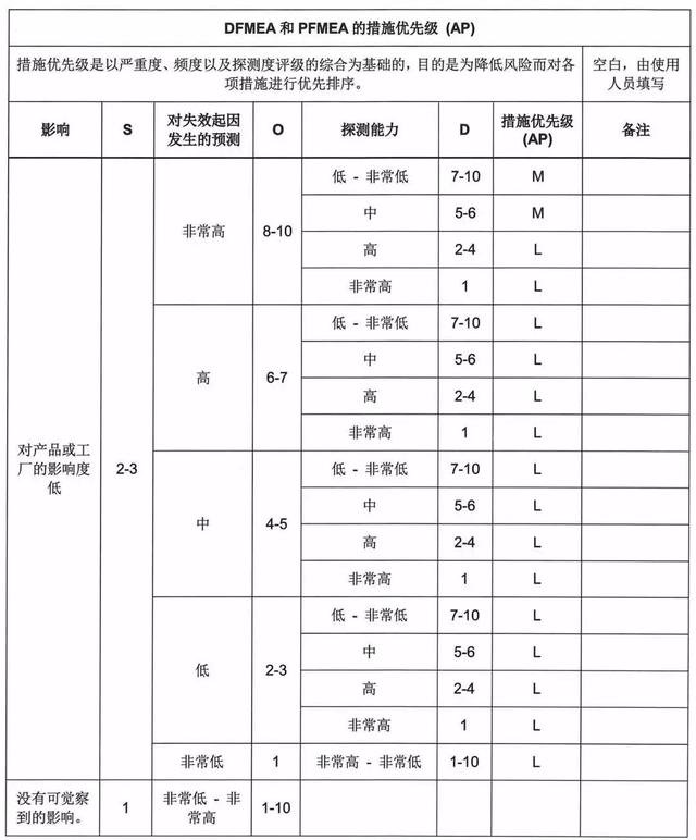 增加風險控制措施優先級AP表格,取代RPN。根據不同的S(嚴重性)、O(可能性)、D(可探測性) 組合,可以通過查表確定相應的風險控制措施的優先級(AP)