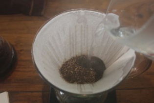 2.倒入15g咖啡粉,然後注入225ml的熱水(92℃)。