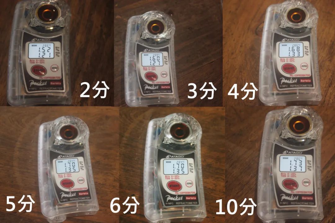 調整研磨度後,發現整體的萃取率都比較高,而5分鐘後均出現金杯理論裡面的“過度萃取”,品嘗後確實也出現了苦澀現象。2-4分鐘的風味比較好,有小番茄和鳳梨的風味占主調,其中在這個範圍裡面隨著時間越長,其甜度越突出。