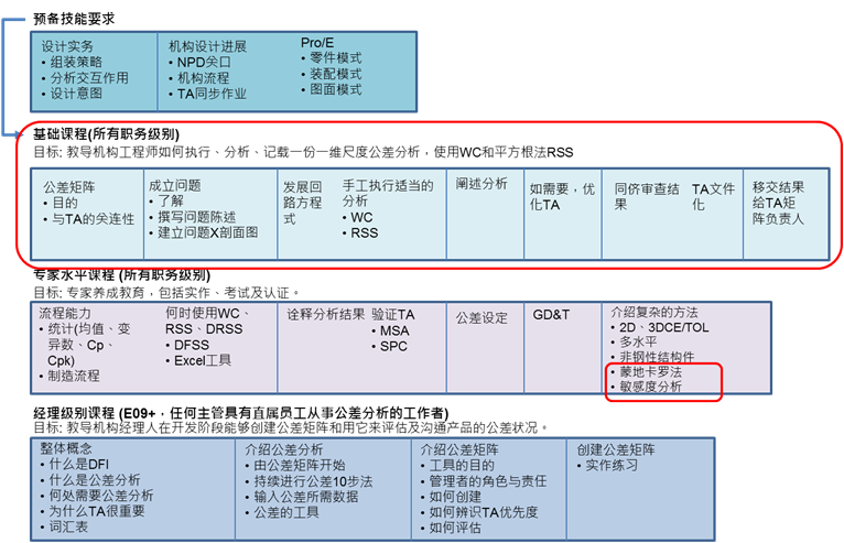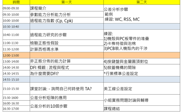 課程目標 在完成本課程後,學員將能夠具備下列能力: 1) 解釋公差分析矩陣的目的,以及如何用它來執行公差分析 2) 詳細說明什麼是公差分析 3) 解釋公差分析的步驟 4) 開發一個回路方程式 5) 解釋何時使用最差狀況WC,平方根法RSS和蒙地卡羅方法MC 6) 使用WC,RSS和MC方法,執行一維公差分析 7) 能夠解釋,WC,RSS和MC方法獲得的公差分析優化和記錄的結果