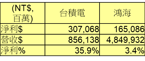 鴻海和台積電都是以製造為主體的企業,是台灣營收第一的企業,台積電是獲利第一的公司。 台積電的獲利能力是鴻海的10.5倍。以總獲利額計,大約兩鴻海才能賺到一家台積電的獲利金額。所以我們認為台積電在DFM的技術含量高於鴻海與其他企業。