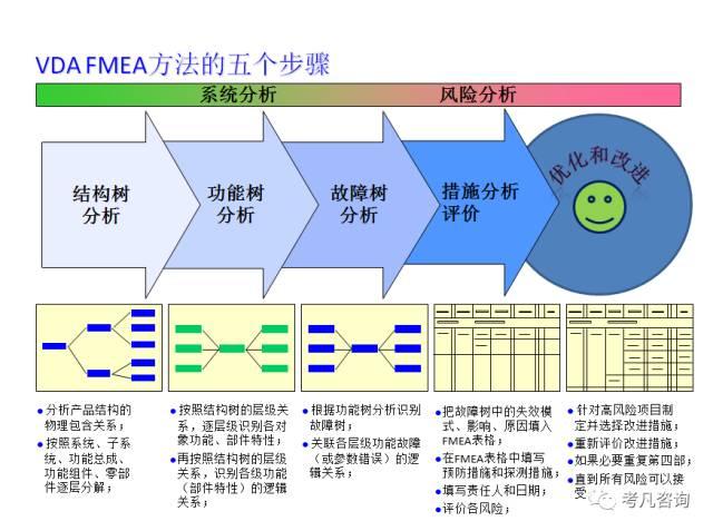 七步法適用於所有FMEA的開發,如SFMEA/DFMEA/PFMEA,分為兩大部分:步驟1-3為系統分析部分,主要是為FMEA分析做好前期準備;步驟4-6為失效分析和風險降低部分,主要是進行失效分析並進行改進活動。