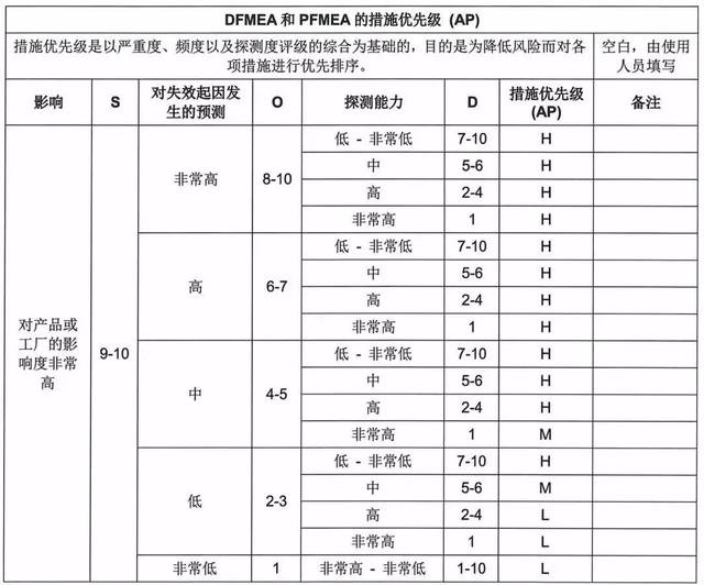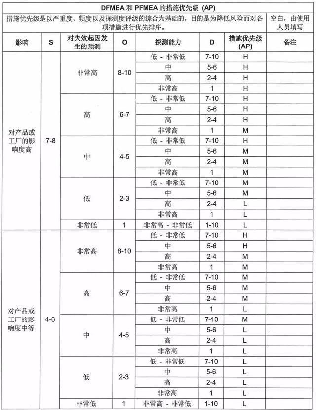 增加風險控制措施優先級AP表格,取代RPN。根據不同的S(嚴重性)、O(可能性)、D(可探測性) 組合,可以通過查表確定相應的風險控制措施的優先級(AP)