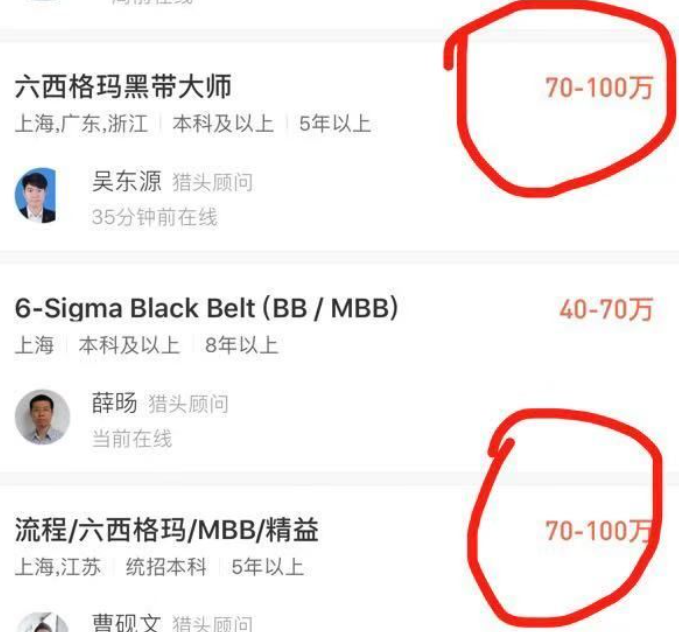 3、證件含金量高。注意圖中有個品質管理師崗,學歷不限、經驗不限都能開70-110萬年薪,很明顯只要你有這個證找個工作很輕鬆。實際上也是,因為黑帶認證不只是要考試過,還必須專案通過,所以含金量比較高。之前有個竹科的小白,拿到了黑帶,換了工作直接月薪80k,薪水翻了倍,職位也得到了提升。