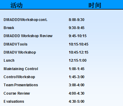 一、課程效益 l 提升對六西格瑪變革管理SSI所貫穿的所有功能的理解 l 提供對DMAIC, DMADDD 和DMADV 方法學及概念的理解 l 掌握在實際工作中應用的基本工具方法 通過Common Sense強化六西格瑪方面的溝通能力 二、目標物件 希望瞭解六西格瑪管理思維和原理的管理人員,未來的專案Leader等。 三、課程概要 通過兩天的知識講解、案例分析結合多個模擬練習,在講師和Facilitator的協助下,分成不同團隊運用培訓的工具和方法不斷改善一個類比的公司流程的品質、效率以及服務水準,並因此體會團隊協作的模式,提升團隊協作解決問題的能力和意識。 關鍵知識點: l 六西格瑪管理概述 l SSI六西格瑪變革管理DMAIC/DMADDD/DMADV方法學 l 理解變異 l 問題/專案定義–團隊憲章–風險評估–聆聽客戶聲音 (VOC)–關鍵品質特性/過程輸出 (CTQ/CTP) –SIPOC 流程圖 用 DMAIC減少缺陷–親和圖–5 Why’s–C& E 特性要因圖–缺陷查檢表–帕雷托圖等 l DMADDD使效率最大化–VOC聆聽客戶聲音–價值分析–未來流程圖–整合計畫 DMADV優化過程設計–BHAG–Paradigm Analysis思維定式分析–概念設計 l 維持結果控制–控制圖–控制計畫–FMEA 四、課程大綱 第一天