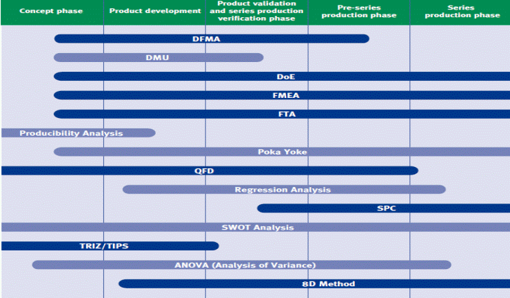 n 除了避免缺陷、節約成本和轉換顧客要求的方法之外,還有一些輔助方法,這些輔助方法在整個產品實現過程中可根據需要應用於問題解決(TRIZ/TIPS)、可靠性分析(FTA)和實驗設計(DoE)等方面。